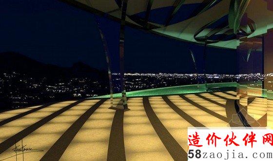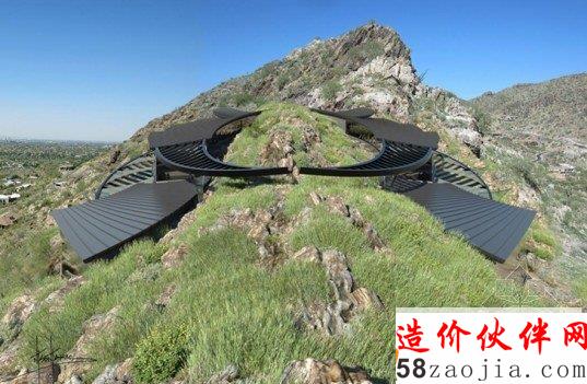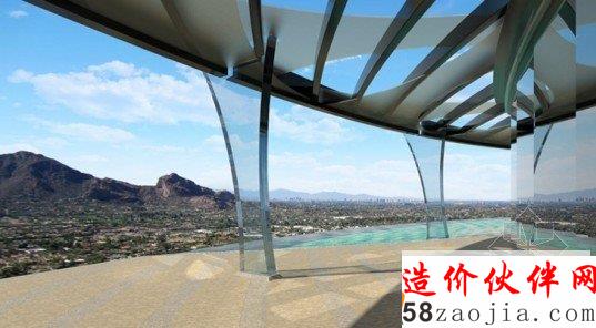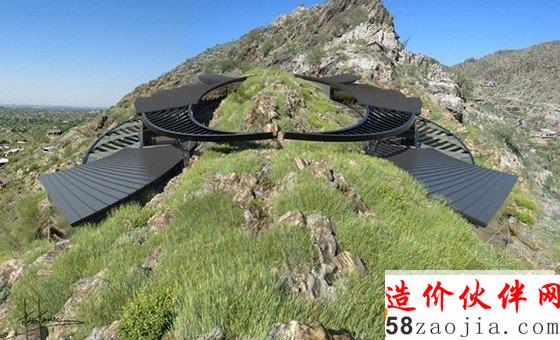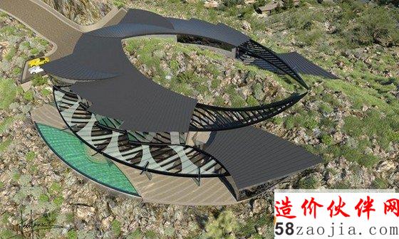 项目建在亚利桑那州的山顶上面,通往住宅的通道上,有两个客人卧室,一个大厅,还有一个可以容纳10辆车的车库。住宅内部则设有6个卧室,8个浴室和一个露台甲板。整个住宅内部分为南北两个主区域,北区为主卧室套房,南区为生活起居区域。建筑的玻璃幕墙透进自然光线,并且带来新鲜的空气。家里的屋顶则是弧形的,可以有选择性吸收太阳能,同时带来时代的审美感。建筑外面是美丽的自然风景区,人们可以欣赏山脉的美景。