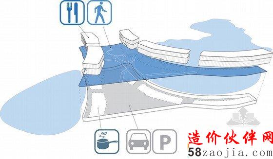 五座单个的建筑围绕水岸,排成一个弧形,这五个单体建筑之间则用水道相连,形成一个水景观餐饮场所,观光庭院和一个泳池。建筑的外观是水晶一样的外墙,地面是白色的陶瓷,与湖泊自成一体,在光线的作用下,建筑与自然环境之间显得更加和谐,闪耀,就像一个梦幻般的天堂一样。