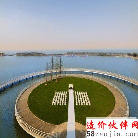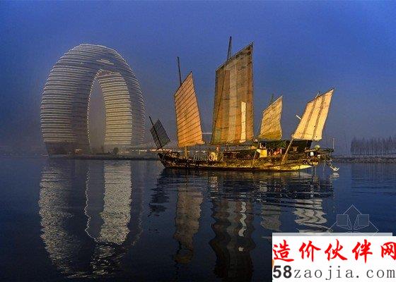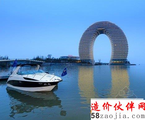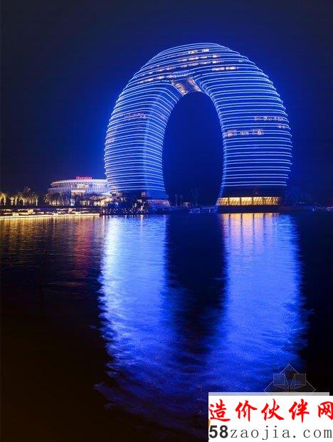 由MAD设计的拱形建筑矗立在太湖水岸,夜晚,室内的灯光从建筑物中照射出来,反射在湖面上,显得格外通透。该建筑主设计师说,这个项目的灵感来自于旧中国画中的桥梁。“纵观中国的历史,人们一直追求着人类与自然的和谐关系,而这些早已成为中国文化和传统的一个重要组成部分”,他说“湖州本身具有著名的传统水墨文化和灿烂的水景观,赵州桥正是集这些优秀传统文化的结晶。”他补充说:“我的目标是设计一个现代化的度假胜地,我的设计理念可以通过这个标志性的环形建筑展现出来,它与周围环境融为一体,同时又突出了美丽的太湖拱桥。”这个建筑共有27层,其中包含282个客房,另外还有39栋别墅,从每个别墅室内都配有一个温泉。酒店的其他设施配备十分齐全,并提供了各种风味的餐厅、宴会厅,会议套房和一个婚礼中心。该项目预计12月正式对外营业。
