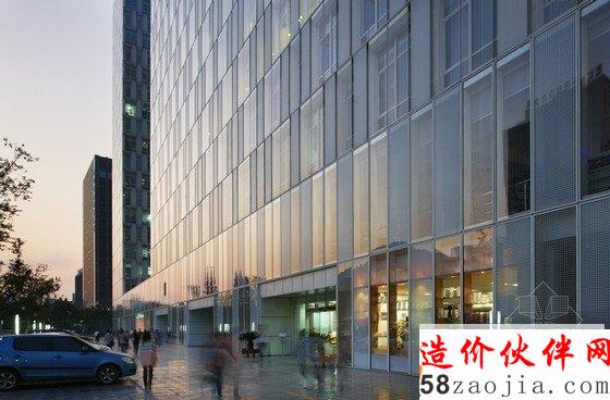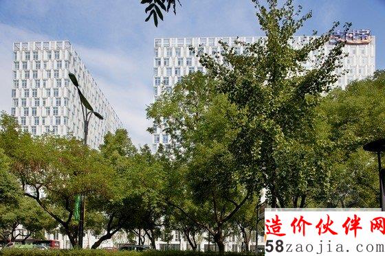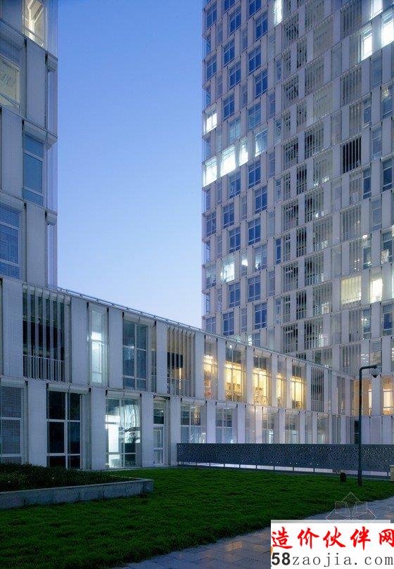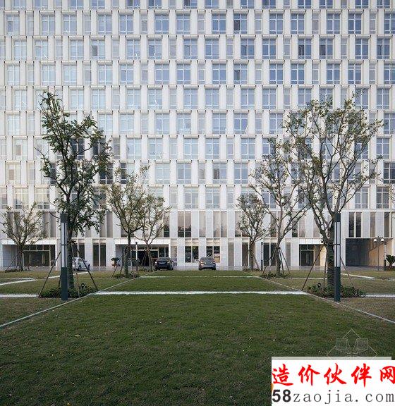 项目位于杭州天目山路,利用基地自然条件,沿街设置板式高层,围合出北向相对安静的内院,下沉庭院不仅有效解决地下室通风采光,同时也丰富室内外空间。8.4的柱网,两跨的空间,四边各2.1米的出挑使每个建筑单体均成总厚度为21米的薄板组合,外向界面采用磨砂玻璃和透明玻璃与双层立面结合,内向界面采用石材与玻璃幕墙相结合,既符合朝向要求又形成不同表情。宛若两块“白玉”成为杭州的西大门。