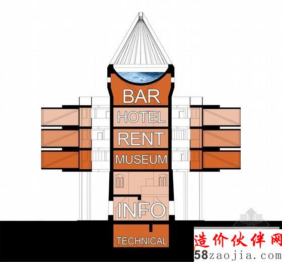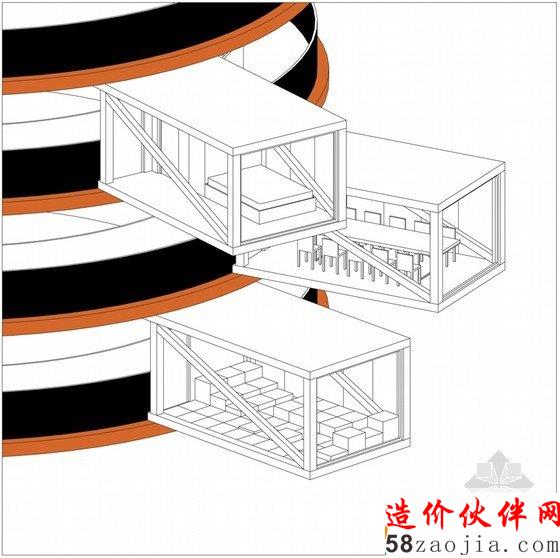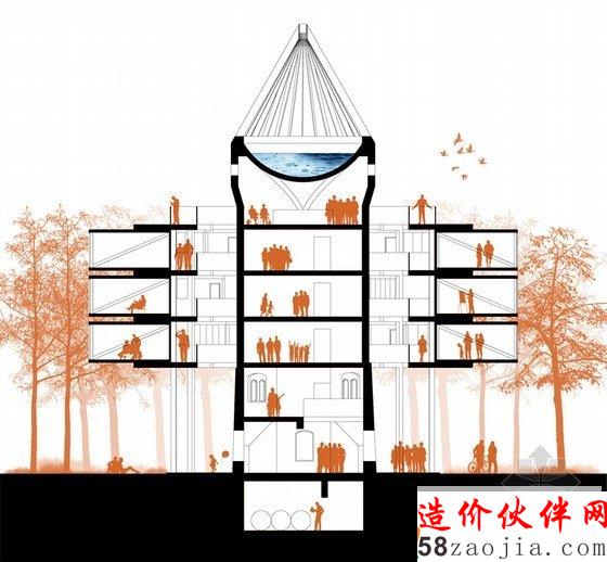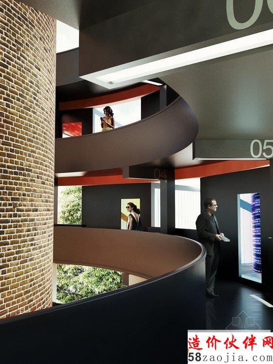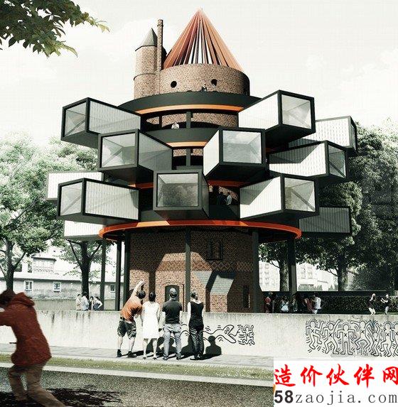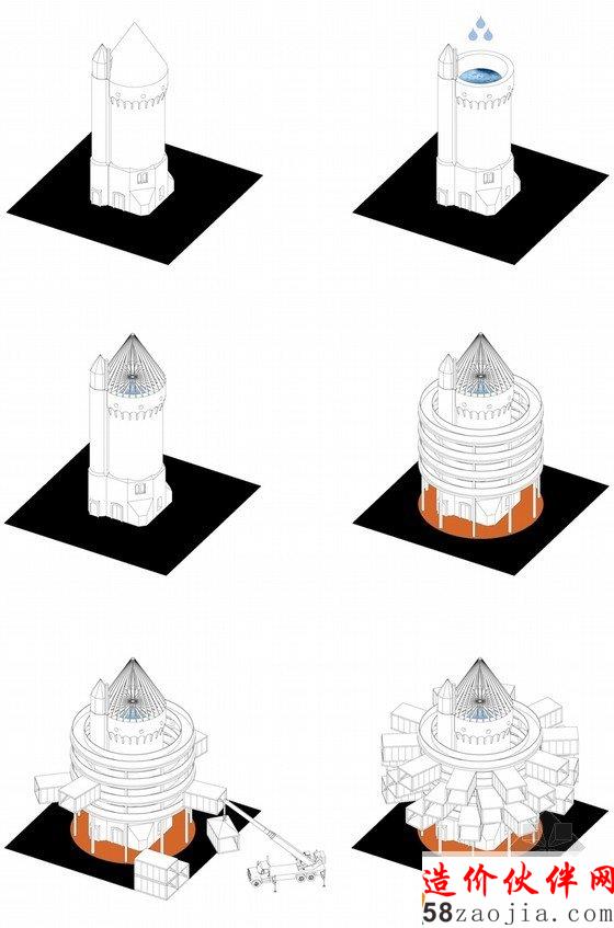 同时它仍旧保持了之前建筑的完整原始轮廓,监狱风格的性格依然可见,只是表面积从190米平方米增大至800平方米。这些新建的功能并不干扰以前的老建筑,而是和谐的成为它的一部分。另外,这些框是灵活的,在其中可以执行不同的功能,这些方格框可以根据需要灵活地组装,可密可疏。该水塔可以作为博物馆供游客参观,也可以用于出租。另外,在该建筑的上层还设计了一个小酒吧,在其中可以拥有全景的视野。
