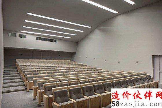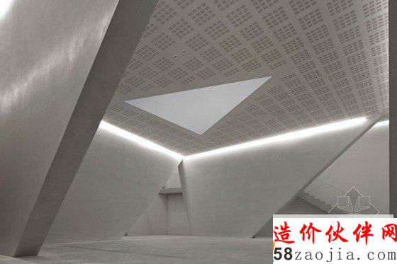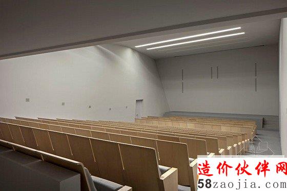 新剧院占地1000平方米,建筑内部包括一个有225个座位的礼堂,一个化妆间,一个控制室,可以举办会议、演出、演讲、朗诵会、音乐会,以及放映电影。建筑风格质朴,以白色为主要色彩,整体柔和,材料采用的是简单的混凝土,设计师在空间设计上做到比例得当,灵活自若。自然光可以透过大天窗照射进来,并且配合艺术作品和电影作品,给予一个全方位无死角的完美展示。