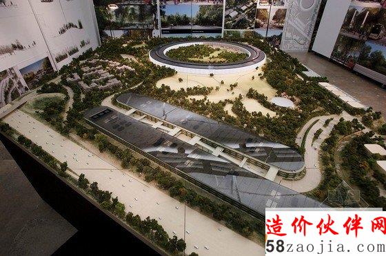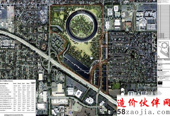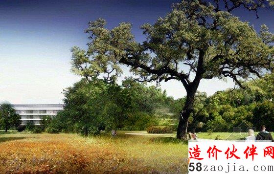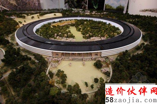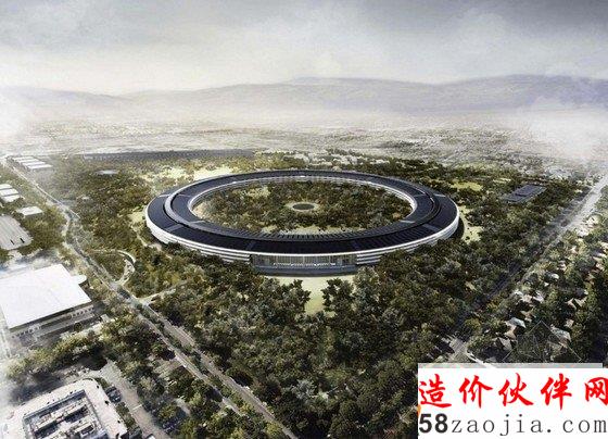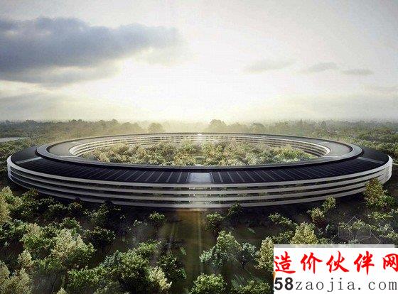 Foster 团队与Kier & Wright共同设计的“宇宙飞船”,占地2800000平方英尺,可以容纳14000名员工办公,还有一间有600座位的餐厅。宇宙飞船大约四层楼高,全部采用的是推拉式玻璃门,整体是一座环形的建筑,四周栽种着大约6000棵树,预算显示大约为500亿元。