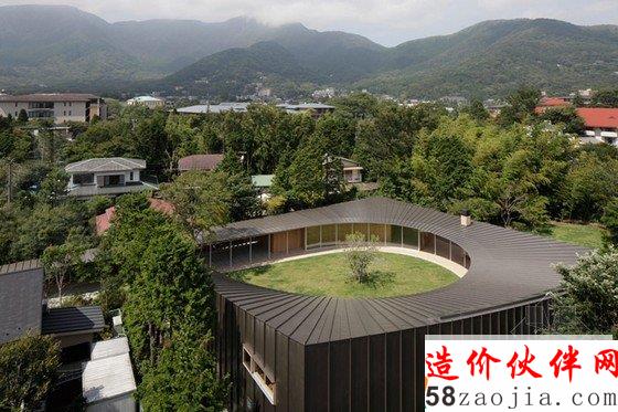 人们住在别墅里面,而别墅的中间是花园,人们可以径自走进这个私家庭院花园里,别墅的外围和圆形庭院的内部都被种植着许多绿植。设计师通过这样的设计让别墅直接与周围的环境发生关联,自然地利用到这些环境。别墅本身是木质结构的,都采用的是原生态木头,而外面的墙壁则是黑色的,房屋高度从2.4米到7.5不等。