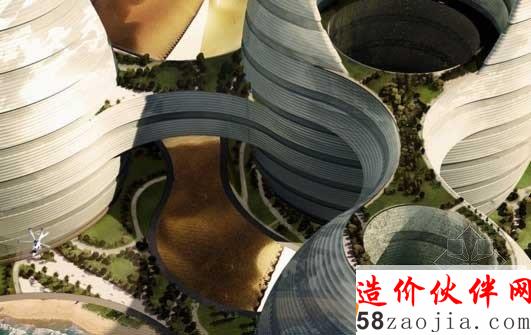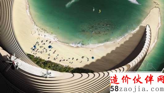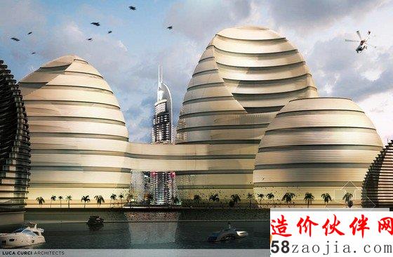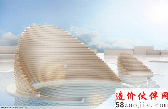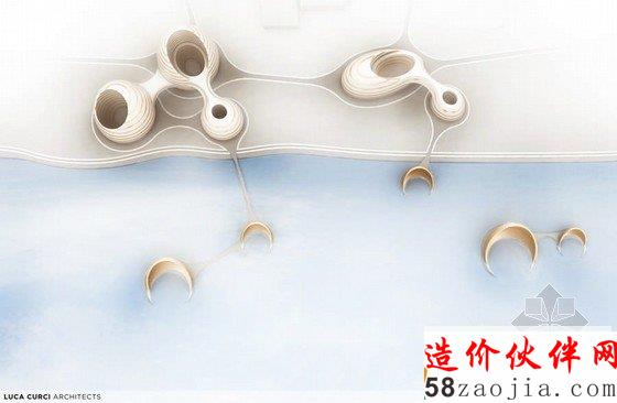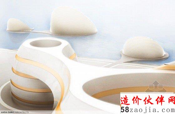 Luca Curci建筑设计工作室设计一个具有里程碑意义的“有机城市”的建筑。这是一个位于阿拉伯联合酋长国天际线处的一个创新项目,这种有机建筑作为新的大都市的一个重要部分,将住宅、业务部门、购物生活领域、健康机构、文化与社会生活中心都融入到一起,就像一个有机城市一样,人们可以在那里生活、学习、工作和社交。该项目分为两个部分,每个部分都像是海面上的月亮一样,这两部分相互连接,道路、公路街道都可以贯通无阻,自在通行。项目较小的部分是提供给私人住宅的,较大的那部分是酒店、商务的集中处,连接两部分的中间部分则可以直通大海。