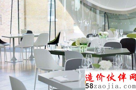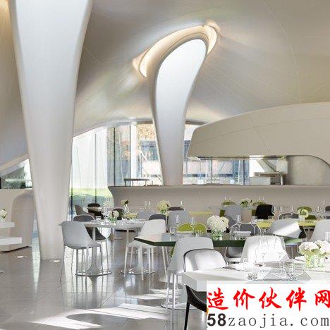 这个蛇形画廊里面的新餐厅还设有厨房和酒吧,所有的设计都是由扎哈•哈迪德主持的。厨师奥利弗•兰格的日本菜盛在纺织车顶,连绵起伏,可以让周边的人直接看到厨师的杰作。餐厅内部的天窗是椭圆形的,下面延伸出曲线柱体,形成一种别致的雕塑,顾客可以通过玻璃墙壁享受周围的园林景观。建筑主体都是由曲线形形态构成的,主要是白色的色调。画廊在9月份正式开放。