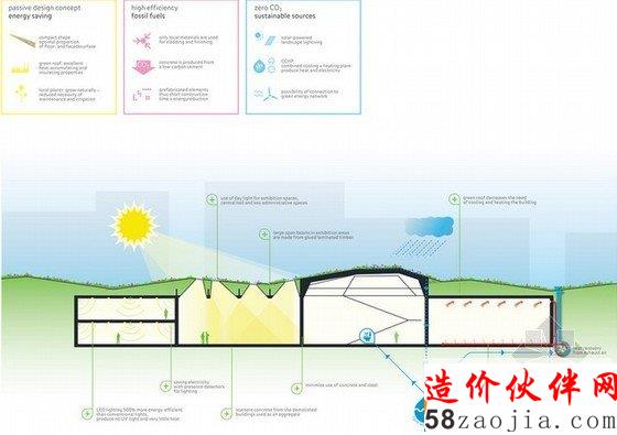 Lazienki博物馆位于华沙知名景点Lazienki公园的地下部分,面积约为1800平方米。整个建筑被一处名为“二十一世纪花园”公园绿地覆盖起来,这块绿地呈三角状,面积约为2.5公顷大小。博物馆的三个出入口由土丘开凿出来,并与中央的大厅相连,在大厅天窗的位置也设置了螺旋楼梯来连接博物馆与地面。从大厅出发可以到达四个不同类型的展览空间:两个大空间和两个小空间。这四个不同大小的展示空间可以用来为不同来的展览提供临时性的场地,而上面的花园将用来发挥其科普教育和休闲娱乐的功能。整个博物馆从外面看起来像是从绵延起伏的地面生长出来的一样,建筑与绿地景观相穿插,形成了一种和谐宜人的景观效果。不过众所周知,照明对于任何地下建筑或是博物馆来说都是至关重要的。对于这样一个复杂的建筑,照明自然也是设计的难点之一。为了博物馆可以有合适的照明条件,设计师设在博物馆的屋顶位置设置了一系列的大大小小的天窗,为场馆提供适宜的自然光线。 有建筑师这样描述这些天窗:这些设置在人行步道周围的大小不一的天窗不仅为地下的展览馆提供了便于控制的、细腻的光线,同时也为地面的花园景观创造了一种神秘独特的意境。