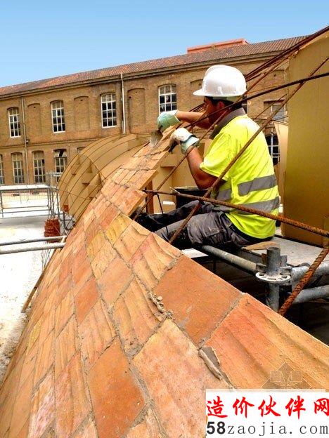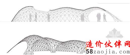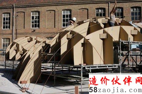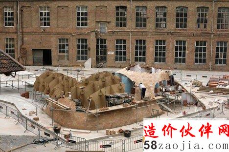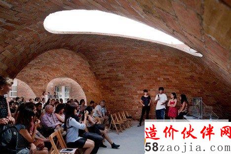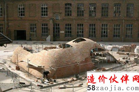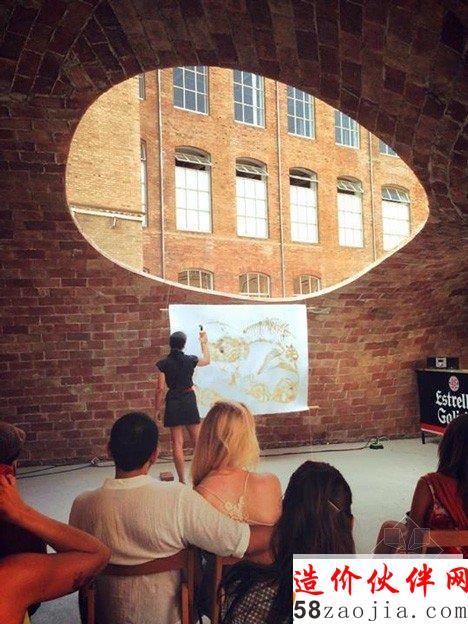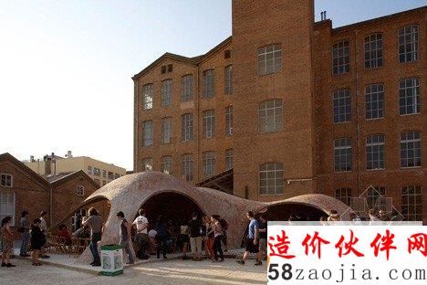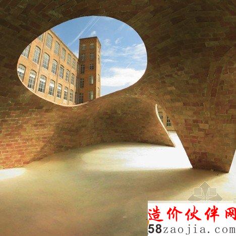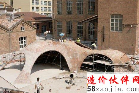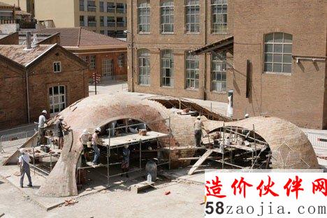 该项目位于巴塞罗纳的一个老院子,Sant Andreu 街的Fabra i Coats工厂原址。设计利用现代化数字工具3D建模软件Rhino和插件Rhinovault,对传统西班牙建筑技法进行了优化。来自苏黎世工业大学的研究员Philippe Block、Matthias Rippman和Lara Davis进行了模型开发。展厅采用了加泰罗尼亚拱顶。拱顶的制造技法,是将板砖纵向铺成柔和的曲线,创造一系列流畅的低拱。建筑师表示:“跟当今常见的建筑不同,该项目旨在还原纯手工建筑的专业性和想象力。”建筑系的学生和志愿者一同完成了项目的建设,利用十字交叉的金属棒和硬纸壳勾勒出基本框架。与原址密切相关的砖头材料,最终构成了四个拱形空间,弯曲的开口自然形成了门窗。