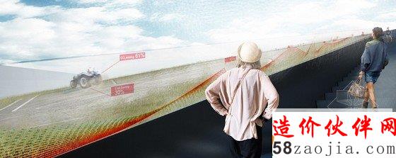 Carlo Ratti Associati的合伙人、可感城市实验室(SENSEable City Lab)主任Carlo Ratti教授表示:“项目的设计理念不单单是建筑屋顶上标志性的自动驾驶的拖拉机,它还展示了在有角度的土地上耕作的可能性。这预示着未来农田可以进行农业复制,还有利于生物多样化和资源保护。这个想法是我的同事Benedikt Gross提出的。项目中的两辆拖拉机将实现零排放,并使用就地产生的能源,不断地向屋顶上方移动,“书写”和耕作整片土地。正如自动驾驶的车辆将引起城市交通的变革,先进的机器人技术也将重塑农业。让创新解决当地地形带来的问题。在展厅里,我们想展示其它重要农业机械的运作情况,从拖拉机到联合收割机,以物理的方式和数码的方式。利用巨大的屏幕,向参观者展示全球各地拍摄的农田情况,突出生态平衡的重要性。”