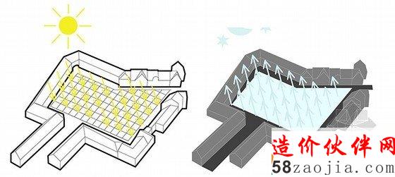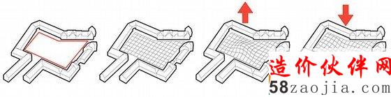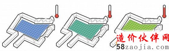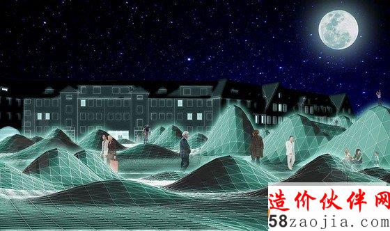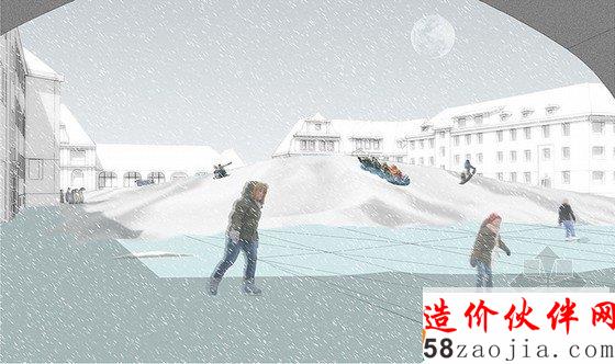 平日里平坦的公共空间可以转化为起伏多变的景观。在相对温暖的夏季,弹性表皮可以延伸为山丘,提供户外阳光浴区;到了冬天,这里可以用来溜冰和滑雪。其采用的柔性材料还可以根据室外温度调整色彩——寒冷时表现为蓝色,暖和时则为青绿色。到了夜晚,这些颜色和发光元素一起,使整个广场活力四射。该结构本身含开孔,辅以传感器,用作雨水排控的流通渠道。雨水经过过滤,或被储存在其下的水池中,或用于喷泉。这一集成系统在夏天供应游泳池,冬天供应溜冰场。景观的形状可以通过一系列液压缸网格进行调整。液压缸与薄膜相连,并且可以通过电子控制。该项目旨在为周边建筑提供能源,直接为环境服务。