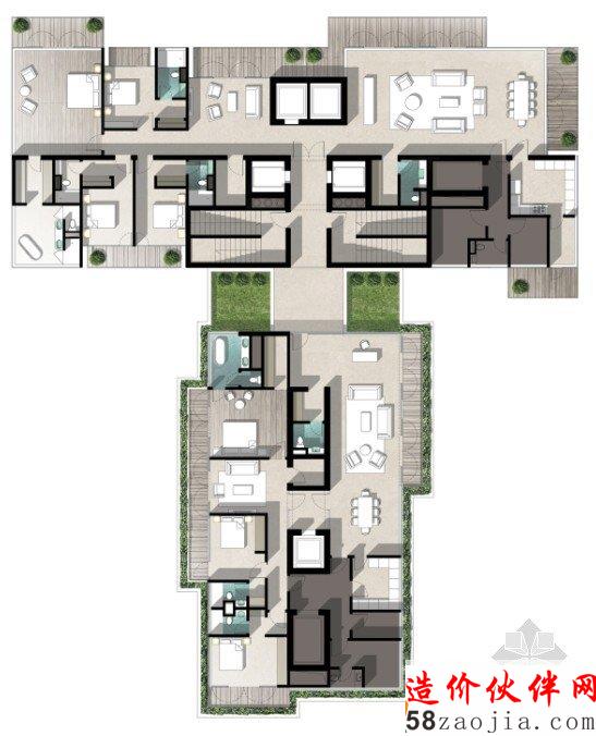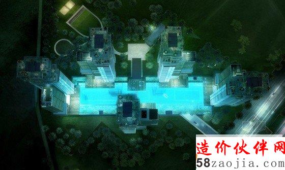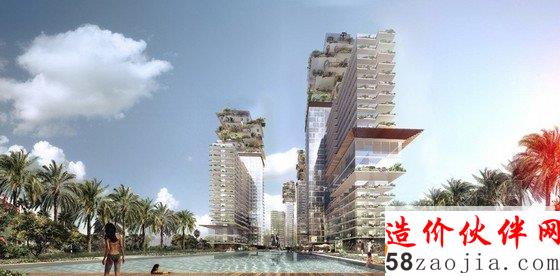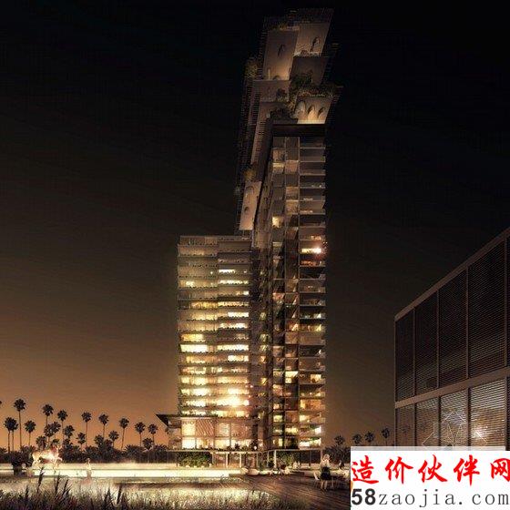 在每个结构的最高点,“绿色云朵”状的大厦延伸部分保证了所有住户可以享用屋顶空间。公寓单位有私人电梯直接连接这些种有花卉和有机蔬菜的空中平台。遮阴区域保证了住户远离印度当地固有的烈日直射,如同法式城堡的茶亭。在印度,豪华的双高度公寓都覆有保温天然材料,如大理石和原木。另外,还设置了一个区域专门供佛,反映出当地的宗教文化。宽敞的开放式广场,连接3栋大厦的大堂,包括一个巨大的池塘。池塘靠近公共泳池的区域,种有芦苇和荷花。
