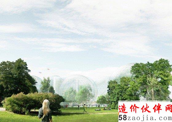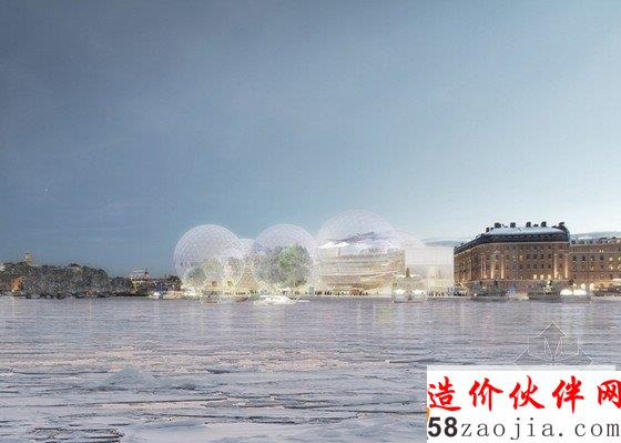 这些球状体量相融相交,构成一系列空间,贯穿整个地块。透明的建筑表皮保障了室内空间和周围环境恒常而直接的关系,还有中心和滨水区的关系,享有城市其它部分的自由视野。这座零能耗的建筑,为使用者提供了全年度的舒适的环境。在温暖的夏季,室内阴凉,覆盖着可折叠的光伏薄膜,同时先进的通风系统也保证了空气经常性的流通和再造。在瑞典特有的寒冬,这些球体建筑会变成温暖的发光体,暂缓外部气候带来的影响。