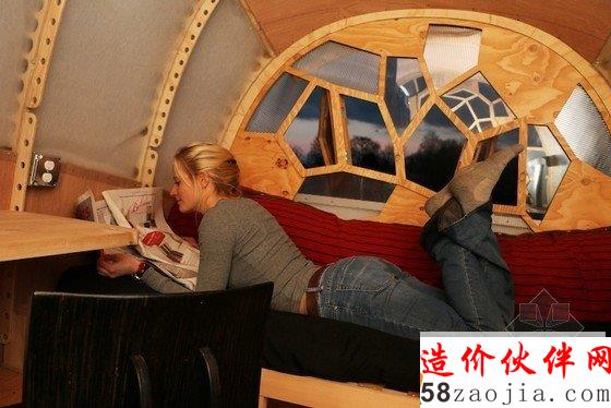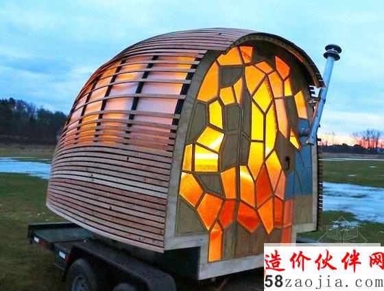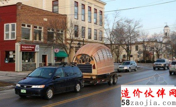 这个自给自足的移动房屋使用环保材料制成,造价仅2000美元。长达一学期的设计和建造过程中,布朗教授的16个学生分成了不同小组分别设计房屋的水、点、热系统和外壳。“可移动的生活方式代表着新的美国梦,尤其在这帮学生中间,”布朗说。“他们对毕业之后的房租和按揭生活不是那么感兴趣。低成本低能耗的私人空间更对他们的胃口。”房屋的框架和窗户是用当地的木材和石板做的,用剩下的材料让学生们用来做了个有机厕所和供洗澡和厨房使用的雨水收集系统。这些轻型的装置可以轻松安装和拆卸,5*8的拖车就能把它拖走。