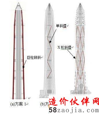 2013年12月19日凌晨,中国第一高楼660m的深圳平安金融中心建筑标高已至300.35m,全面突破300m大关。平安金融中心项目位于深圳市福田中心区,总用地面积18931.74 m2,总建筑面积460665.0m2,建筑基底面积12305.63m2。塔楼地上118层,标准层层高4.5m,塔尖高度为660m,主体结构屋盖高度为588m,主体顶层楼面高度为554.5m,建筑面积约319416m2;商业裙楼地上11层,高度约53m,建筑面积约49785m2;扩大地下室5层,深28m,柱网9m×9m,建筑面积约81035m2,总建筑面积约45万m2。建筑功能为办公、交易、会议、商业、观光及餐饮。设计过程中采用了3种方案增大巨型框架所承担的剪力:1)将8根巨型柱从底到顶倾斜(方案1);2)在带状桁架间设置单斜撑(方案2);3)在带状桁架间设置X形支撑(方案3)。采用上述方法均能有效地提高巨型框架承担的剪力,经各专业协调最终采用在带状桁架间设置单斜撑的方案2。