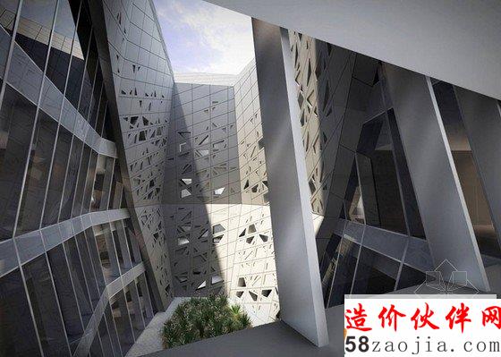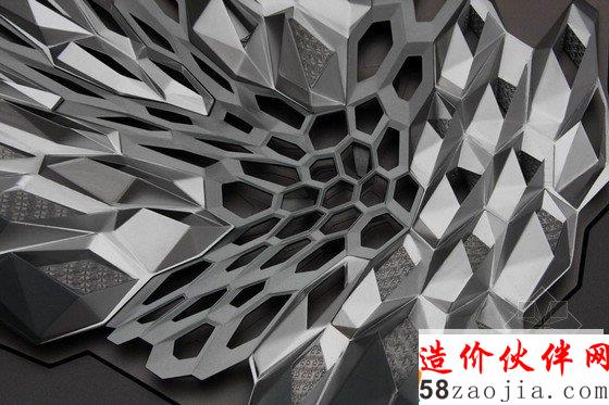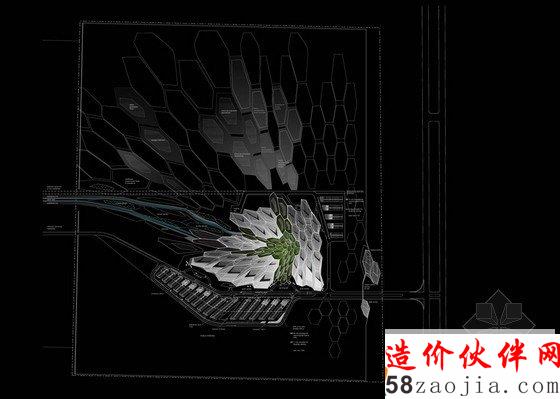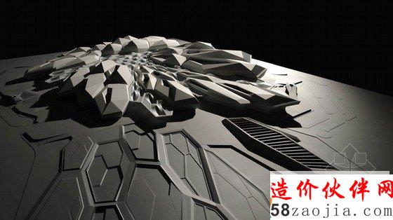 这个项目是由三维6面体细胞网络组成的,中央高于周五的沙漠景观,犹如一个晶体聚集物一样。立体的设计能够让每个空间有不同的结构。外层类似贝壳的材料将内部透气面盖住,半遮挡的庭院给整个建筑带来自然光照。这种组成能让室内外温度有一个缓慢的变化。环保的角度看,这座建筑尽量打造的和周围环境完全融合,将能源和水的消耗降到最小,并且用到最先进的可循环措施。