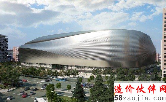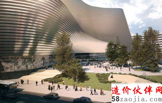 俱乐部主席要求要彻底的改造原来球场,外观要具有标志性而且富有活力。此外,改造工作不能影响当前体育馆的使用。设计不对称的曲线金属外墙反射的光线创造千变万化的效果。流动的横向线条能很好的诠释体育运动的活力与能量。晚上LED照明系统会使外墙反射出柔和的灯光,灯光在颜色和强度上发生变化,同时可以为建筑内部照明。照明系统还可以把建筑立面变成一块巨大的屏幕,投射各种影像。新安装的可伸缩的屋顶使该场地用途变得更加广泛。顶棚将使用聚四氟乙烯膜做外表面,用板条支撑,增加防晒层。顶棚膜是部分透明的,这样白天自然光可以照进体育馆,而体育场内部结构和服务区则是隐藏在半透明膜以下的。“卓越的想法是另一个强大的灵感。皇马的“银河英雄”让我们想到一个抛光的宝石,变幻光和色彩的神奇皮肤 ”L35表示,“设计团队主要设计基础是用最新科技手段打造一座节能并且与周围环境和谐的建筑。我们为达到了所设定的目标感到骄傲,并且我们坚信人们会对这个新体育场一见难忘。” L35执行合伙人tristán lópez-chicheri说。该设计还包括建设一个新的酒店,能以很棒的视角看到体育馆,还是购物休闲中心、地下停车场和景观公共空间的整合。施工计划于2014年6月开始,初步定于2017年完工。最近,马德里球队最伟大的对手,巴塞罗那也公布了自己的球场重建方案。