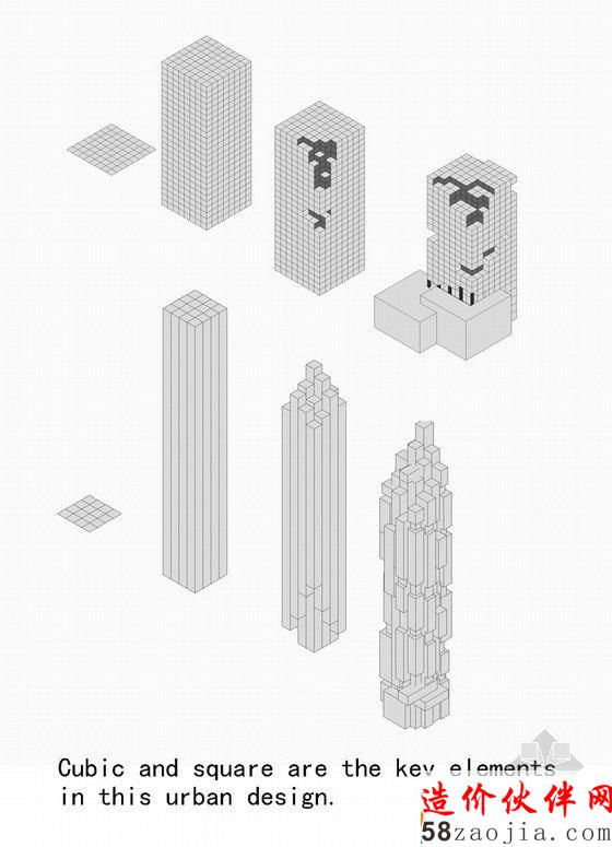 附近的山脉地形是方案的灵感,设计的场地本来就是一个高差达45米的山地。整个景观包含高密度的高楼,斜坡底部就是著名的嘉陵江。这个规划基于立方的几何形态——高楼附有不同的功能,并且簇拥在一起组成一个整体。高度较高的楼在地势高的地方,而较低的楼在地势低的地方,形成了一个阶梯。一个大广场作为“城市的露台”,为人民提供休憩场所。人民可以在里面休息、交流、享受美景。远处2座高楼描出了天际线的轮廓,像一个巨型门廊要你进入城市的入口。绿色走廊将这个区域变成了一个连接市区和嘉陵江的自然景观阶梯,也是一个“城市绿肺”,它的地下是商业广场和停车场。建筑的外观是根据山的地势得来,为了提供更多的公共空间和人行走道,为了会将车行道移入地下。建筑中结合了当地的建筑特色以及现代化的建筑预言。