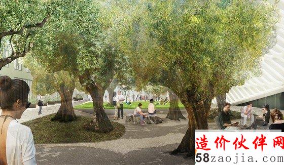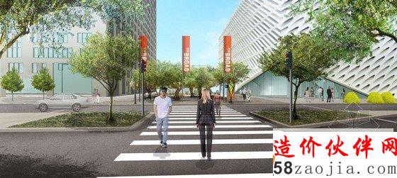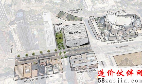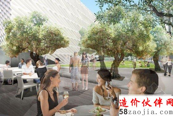新的人行道将连接周边地区的当代艺术画廊。除了公共广场,领衔参观老板bill chait将开发一个新餐厅。hood design和 DS + R设计的景观包括了100年的橄榄树,使广场和道路之间有一个阴影缓冲地带。广阔的草坪会使密集的树木林更加突出,可以作为博物馆的室外服务场地,举办包括电影、表演、招待会和教育活动。配有树桩桌子和可移动的座椅,适应性强的公共空间将允许客人以自己的目的和喜好来配置这块区域。确保一个更适合行人的环境,加宽了格兰大道的,并在大楼前面种上中国黄连木。LED路灯和掩埋式地灯将有效地照亮建筑外观结构。“我们的广场的设计加入了洛杉矶市中心的新精神,混合文化、娱乐和食物。邻近的机构将能够分享景观空间来进行开放或私密的活动。” DS + R的成立校长伊丽莎白迪勒解释说。“格兰大道上无与伦比的建筑和文化机构需要更多的户外行走绿色空间,来创建一个充满活力的城市核心。”eli broad说,广泛的共同创始人。广场的建设已经开始,预计在2014年晚些时候开放。the broad博物馆在2015年开业。