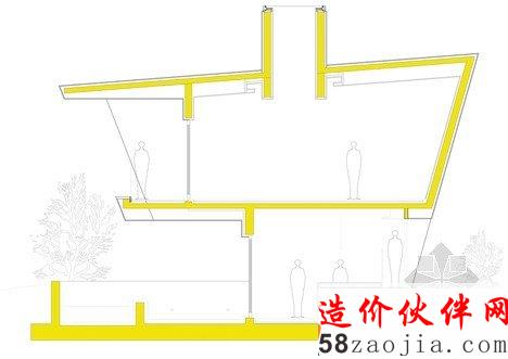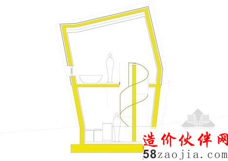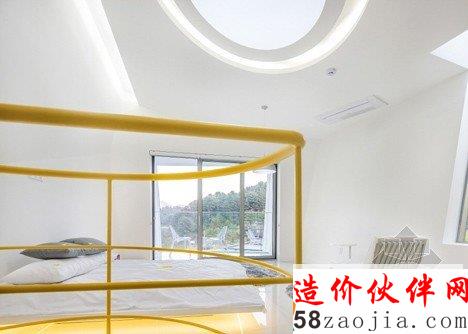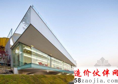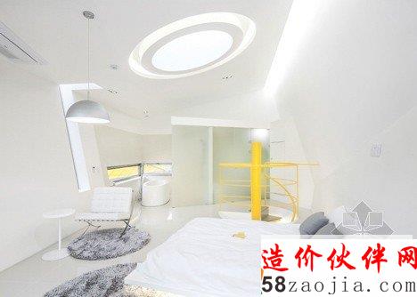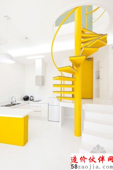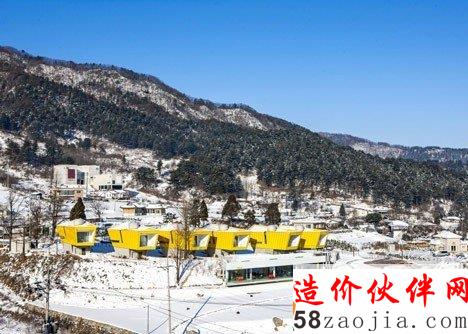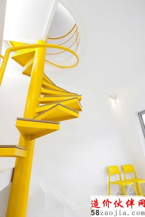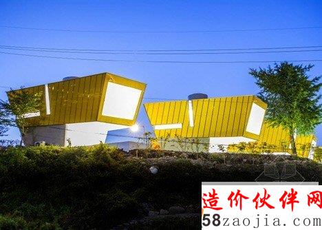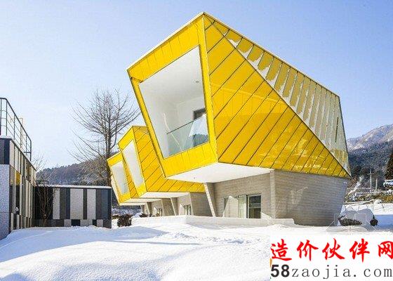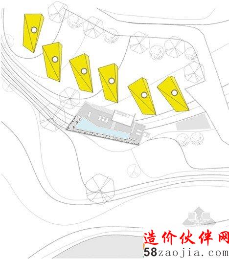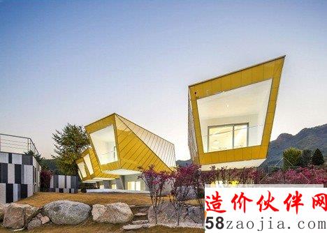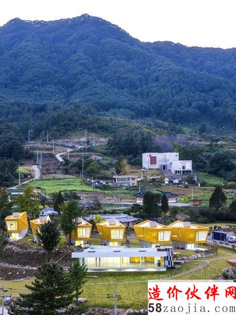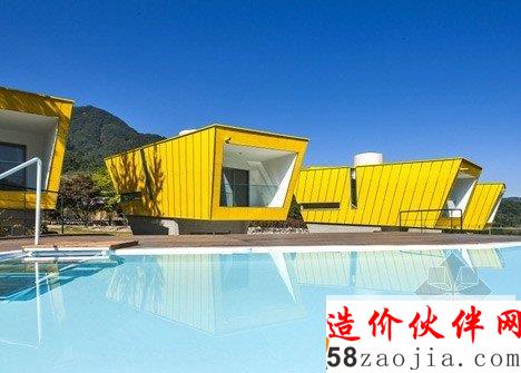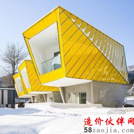 这6做建筑位于Gapyeong县的一个温和的山坡上。像雕像一样,,6座建筑都有相同的形状,头重脚轻的体积与混凝土基础。他们也彼此排成一排,以便看上去每个楼都面临着同一个方向。“大多复活节岛雕像有类似的形状,” 设计师Jae Hwan Lee说。“这个项目也安置类似的大规模斜面,创建一个通过重复强调空间的地方。”明黄色的板复合悬在建筑上,这样他们在绿色景观中很突出,建筑师说这些房子可以作为游客去植物园的标志物。明黄色在室内再现,黄色的和门、楼梯和家具与灰白色调的墙壁形成鲜明对比。每个住宅都包含一个底层的厨房,一个小露台和游泳池,卧室、浴室和则在高层。
