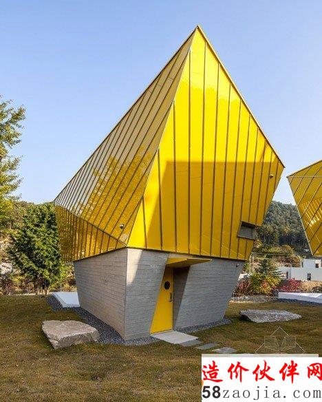 Koossino设计的韩国亮黄色不对称度假屋