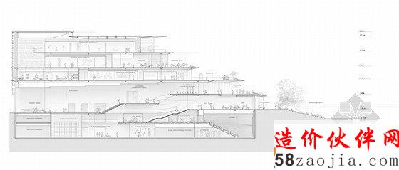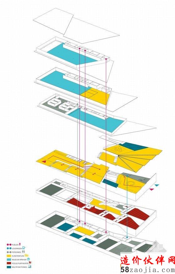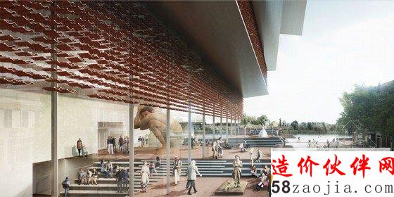 总体规划的一部分设计重新连接了阿纳姆市和莱茵河,“ArtA”将在这个地域的重塑中发挥重要作用:刺激新项目、公司的产生,激发整个城市的积极性。该设计在两个方向上与周围环境有机的结合、连接。一方面建筑极具现代化规模,与河岸更密切得相连。另一方面,种植空间促进可持续发展和绿色城市的规划,对该地区未来的发展有长远影响。一条公共街道连接莱茵河和城市,轻柔的小瀑布池将水引入形成镜面反射。建筑的外层是由红粘土瓦片做成的丝细墙,保护敏感的画廊免受阳光直射。同时,幕墙提供一定的透明度内部和外部空间之间的视觉联系。博物馆的永久收藏位于三楼,临时展览在最高层。内部展厅并不是一系列白色方形房间,而是直接由展览的需求定制,贴合艺术品、游客和阿纳姆本身的需要。作为城市的扩展,“ArtA”是一个放松和娱乐的地方——一个文化的发电机,而不是文化的容器。