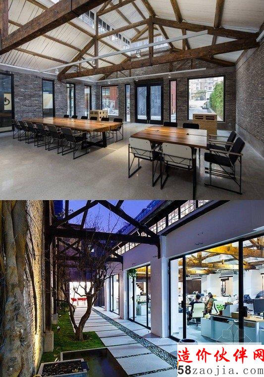 章明:以新近完成并搬迁的原作设计工作室为例,讲述了一个连做仓库都被嫌弃的上海鞋钉厂老厂房,经设计师的妙手化腐朽为神奇。利用混凝土密封固化剂整理地坪,保留青砖墙面和木屋架,白水泥材料辅以阴刻字被应用于桌面,木材以燕尾榫拼接设计的会议桌,自行设计并安装的镀锌水管灯,植物、水面组成的庭院向工作空间开放……原有的老厂房依稀可见,但已完全换做新的功能。