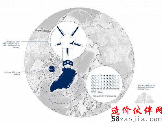 它提出了一个流动无图农业设施在漂流格陵兰岛和加拿大之间,利用营养丰富的冰山融化的淡水进行大规模水培农业。受格陵兰岛的村庄启发,浮动设施具备为垂直的分布形式,可以容纳800人。这个项目是为应对格陵兰岛的农业依赖,他们需要进口所需的几乎所有的新鲜水果和蔬菜。提出寻求解决方案不仅提供需要,而且是可再生的模型。在未来,可能摇摆不定的格陵兰岛的贸易平衡在这个行业从赤字到盈余。为了在贫瘠的领土上寻找一片肥沃的地区, Arctic Harvester部署各种技术、能源和社会策略。一个圆形的建筑,让冰山进入中央湾,收获的淡水引向水培种植层,然后渗透能源植物。整个过程保留淡水作为可重复使用的资源。中央海湾因此是Harvester的农业的核心过程,其可持续能源生产的中心,以及一个冰花园,提供社会空间和浮动公共温室供居民使用。设计的每一个细节的设计尝试有利地结合海洋大部分未开发的资源,为了创建一个与环境互利模式,和提供格陵兰和北极一个有形的经济替代。