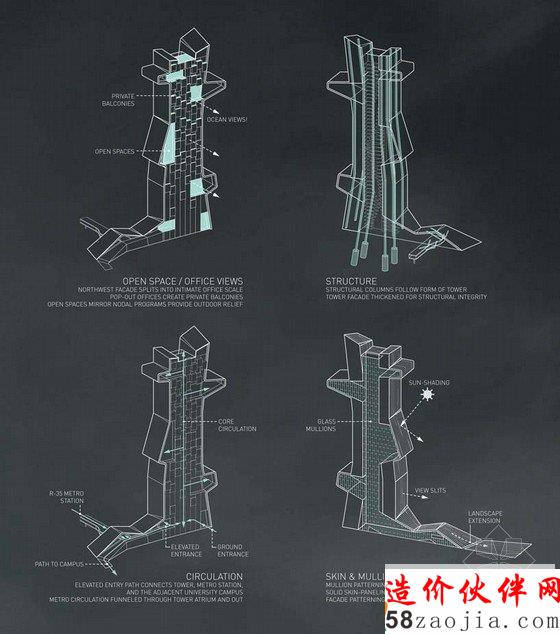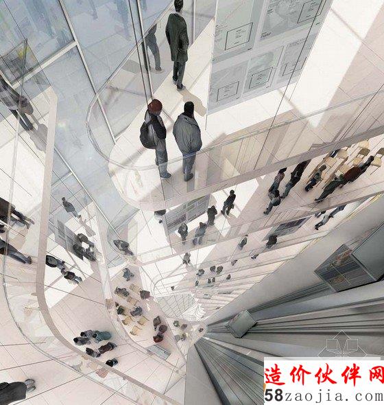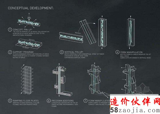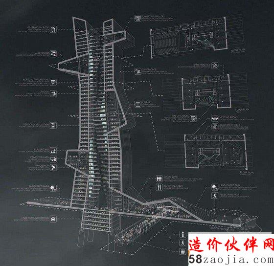 透明的立面是基于“招贴栏”的概念空间——在大多数学校学生分享他们的想法、协作和参与学术批判的地方。由于高层的结构,通常水平展开的区域成为一个垂直的空间,与周围的环境形成强烈的视觉和物理连接。工作室在一个连续的螺旋开放的空间,它的灵活性可以适应未来的不同的功能需求。教授的办公室直接相邻的各个楼层的工作场所,提供一个统一的教育环境。公共户外露台来帮助学生互相培养社会和学术互动。