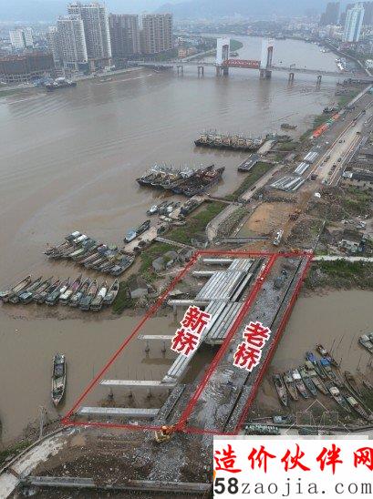 左侧的老桥开始拆除,右侧的新建桥面比老桥桥面高出约1米。