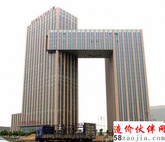 上图为河南省郑州市有一栋由同济大学建筑设计院综合设计一所主持设计的郑东新区电子商务大厦,因外形酷似中央电视台新大楼而成了名楼,被戏称为挑战央视大楼“大裤衩”的郑州“小裤衩”。
