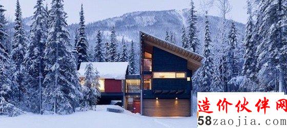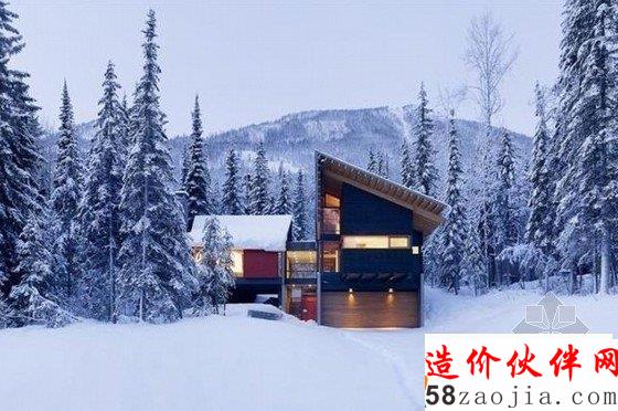 3.Kicking Horse Residence(不列颠哥伦比亚省,加拿大)屋顶的设计,使雪的重量不是负担,小屋的倾斜设计使雪自然降落。