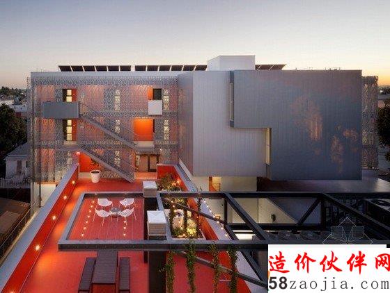 8.Cherokee Studios(加州,洛杉矶)公寓楼是由布鲁克斯+斯卡帕设计。为保持室内舒适的环境,建筑外表面覆盖氧化铝板。这种结构形式,比附近建筑节能40%。