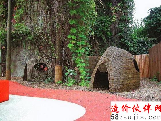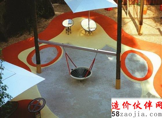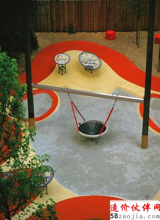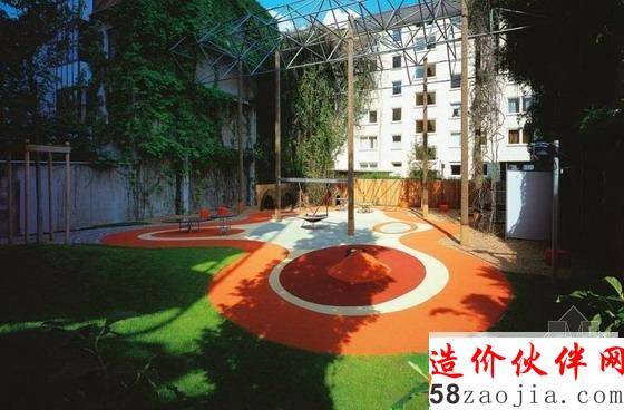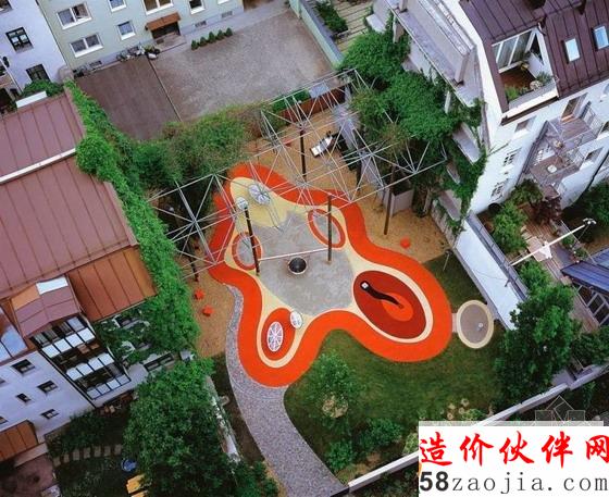 欧洲专利事务所为它的日托园修建了一处面积为450平方米的游乐场,它位于慕尼黑市区的一处空楼旧址上,周围楼群环抱,紧邻一面墙壁,游乐场刚好犹如明珠般占据了整个区域的中心位置。大约10米高的多层空间结构犹如屏障般对游乐场南面及其北面的建筑起到了较好的遮护作用,而那些郁郁葱葱的攀援植物就沿着木棒蜿蜒而上,为这些静静矗立着的建筑增添了几许清新、几许生机。