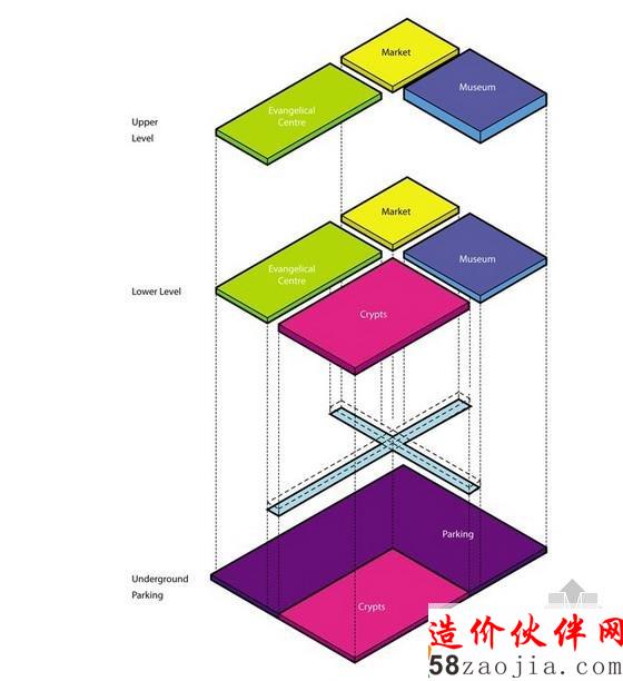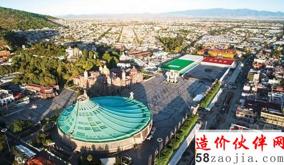 FR-EE设计的68 000㎡的开发项目以圣若望·保禄二世的纹章为基础,包含一个十字架,大写字母“M”位于其中一个象限内。该方案用瓜达卢佩圣母的画像取代了M,巨大的玻璃十字架定义了体量的四个象限,创造了通道,并提供了从教堂中庭进入场地的入口。