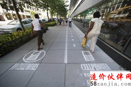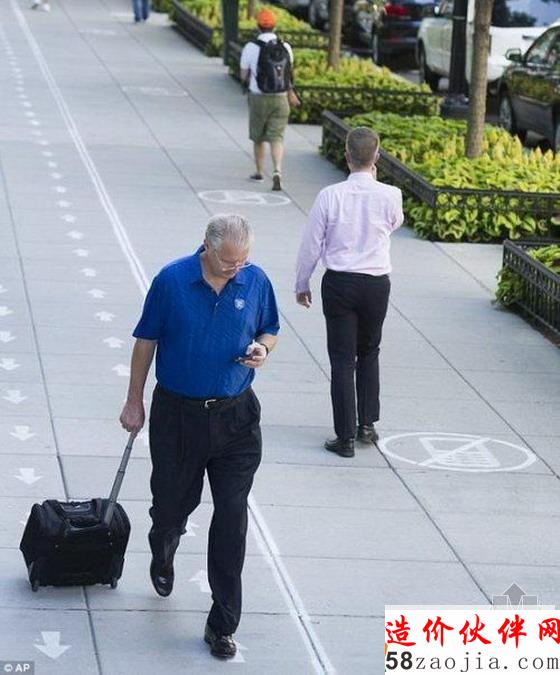 习惯边走路边玩手机的行人需要在划分“可以使用手机”的通道行走。这条街的设计方便了那些走路匆匆,不看手机的人。