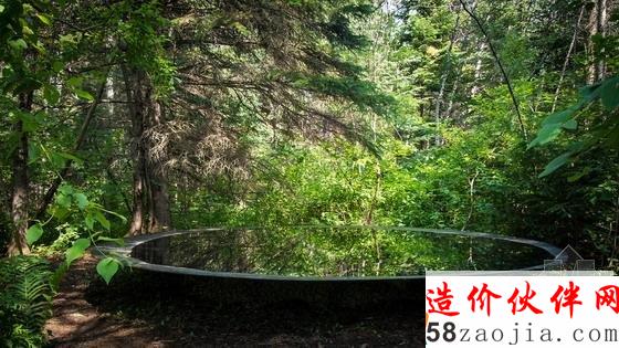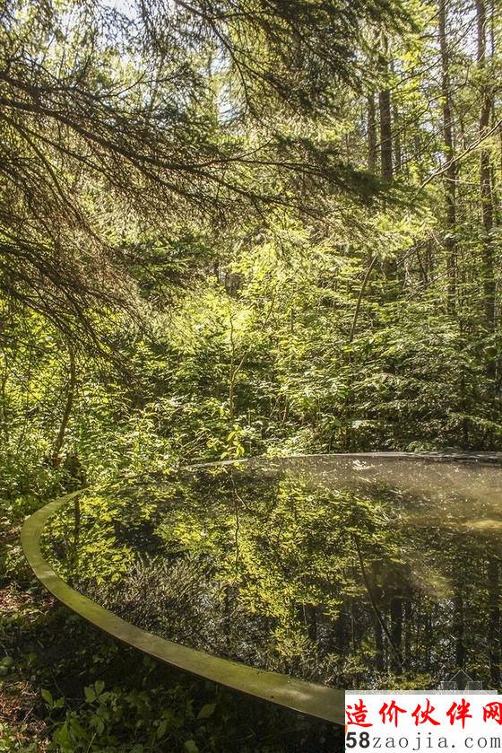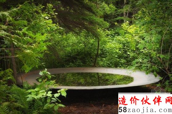 美丽的森林环境中,树木和天空映射在宽广的圆形浅水池里,这个“黑色水镜”设施由西班牙建筑师群Citylaboratory在加拿大魁北克国际花园展中设计并展示。该项目是比赛前六名获奖者之一。“黑色水镜”悬于地面,浅水池内充满水,反映着森林里的自然面貌:野生动物、树木、天空等,时刻捕捉大自然的美。设计师认为:“水镜的用意是通过捕捉边界之外的事物将周围环境变成自身的花园景观。”