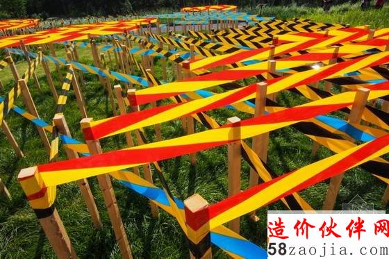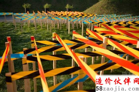 该装置将传统花园的设计语言与现代批量生产的安全建筑材料元素结合起来,形成了带来强烈视觉效果的图案,创造了一个抽象的花园空间。商业警示带构成紧密的平行线条,这些线条划定出几何区域。设计师将有序的人为元素置入自然环境当中。并存的不同元素表达了保护和安全防护的共同主题,同时引发人们对什么是真正的自然的思考。