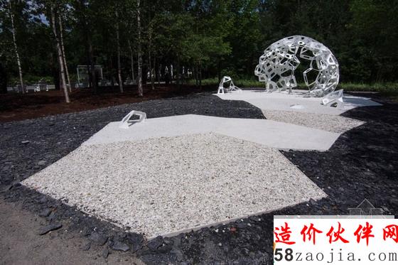 这是一个由椎体构成的凸起发声装置。它会根据不同的触碰方式发出不同的声音,让你在美丽森林的中央听到风声和海浪声。这些椎体多见于施工场地。该装置是此次国际花园节(International Garden Festival)最早设立的装置,直到活动结束后才会拆除。它形象地表达了人类控制环境的愿望。层层叠叠的椎体被堆积成小山丘的模样,它与自然母亲和谐相处的旅程才刚刚开始。