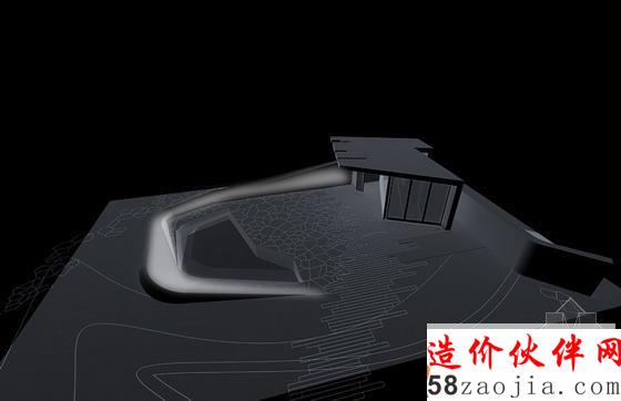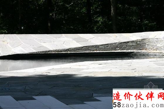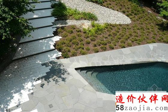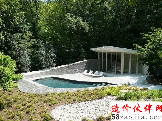 建筑材料筑成的通道成为连接风景和建筑的缔结组织。白色的混凝土路面从屋内延伸到室外,与青石路面环环紧扣,形成通向泳池平台的小道。白色混凝土道路折叠盘旋在泳池平台之上,延伸至泳池小屋。散石挡土墙将泳池小屋和泳池环绕在周围的风景中。