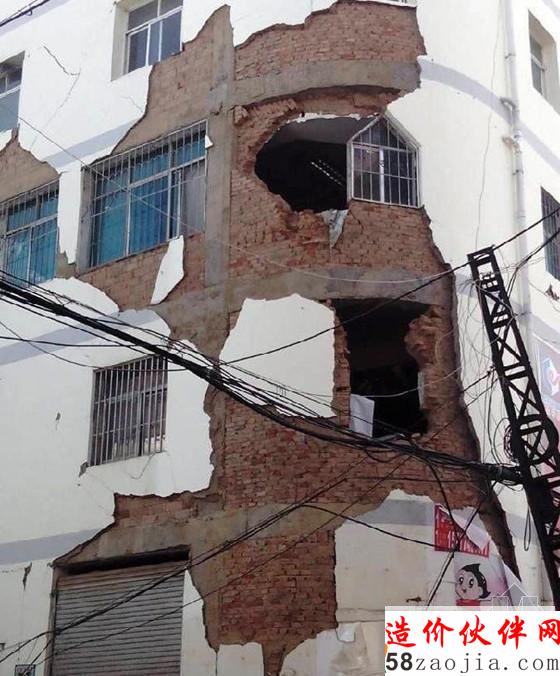 云南昭通市鲁甸县一建筑外墙受地震影响剥落(手机拍摄,8月3日摄)。据国家地震台网测定,北京时间2014年8月3日16时30分,在云南省昭通市鲁甸县(北纬27.1度,东经103.3度)发生6.5级地震,震源深度约12公里。