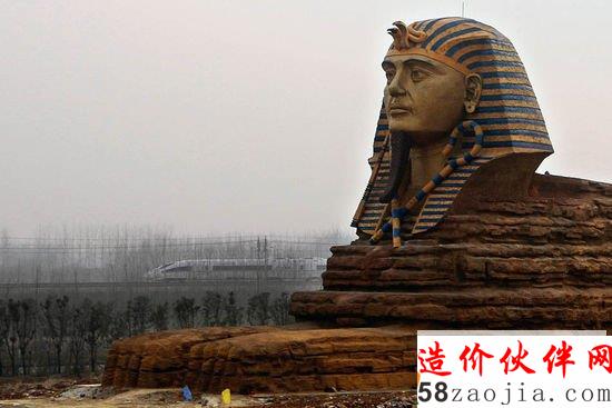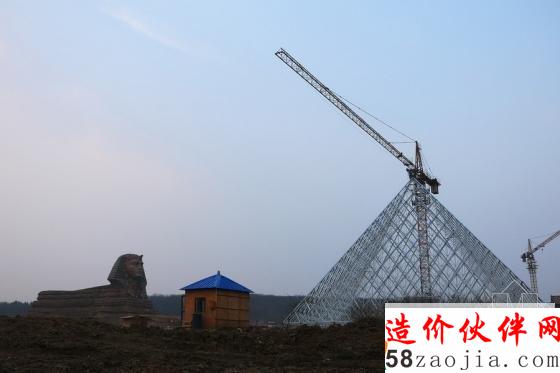 “狮身人面”雕塑的对面是正在建设中的金字塔