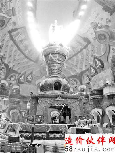 又往下走了两层,楼道里面突然亮堂了起来,记者走进了该楼层,里面灯火通明,还能听见电锯切割瓷砖的噪音,楼层的中间是一个类似于圆柱体的建筑,上面有个小窗户,记者走进了小窗户,往里面一看,顿时一阵激动。原来这个圆柱体有两层楼高,正中间放置的正是大舍利塔,圆形的墙壁上坐着“满天神佛”,而记者所站的小窗户其实是“莲花台”,这将来是给游客在上面观景的。