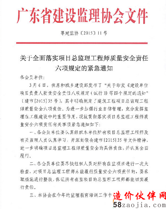 [广东]关于全面落实项目总监理工程师质量安全责任六项规定的紧急