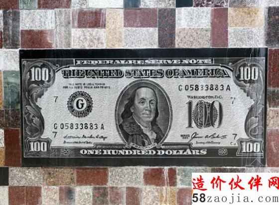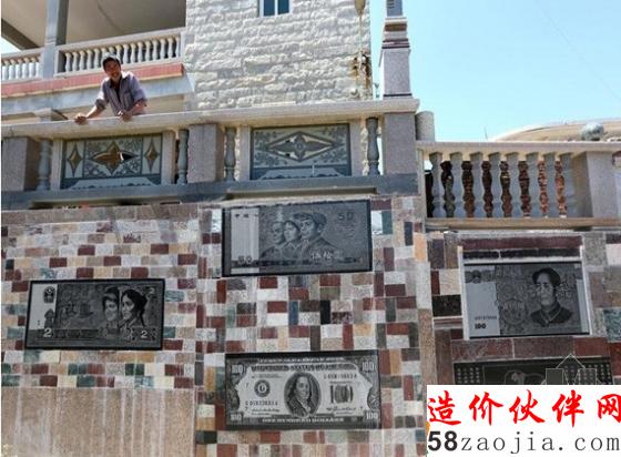 2015年4月1日,福建泉州,围墙长约二十米,墙面上贴着9幅各类钱币图。屋主赵先生介绍,钱币围墙花了3万多元,一张要由专业人员打2天。2014年6月,赵先生打算修建围墙,觉得钱币图好看,便放大了几张钱币图贴到围墙上,之后又找专业石雕师傅根据放大图雕刻出来。打一面钱币图大约需要500元。钱币围墙出现后,赵先生家门口竟也吸引了一批又一批“粉丝”,时不时有过往行人停下观看拍照。