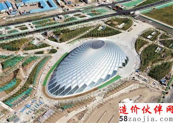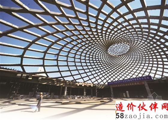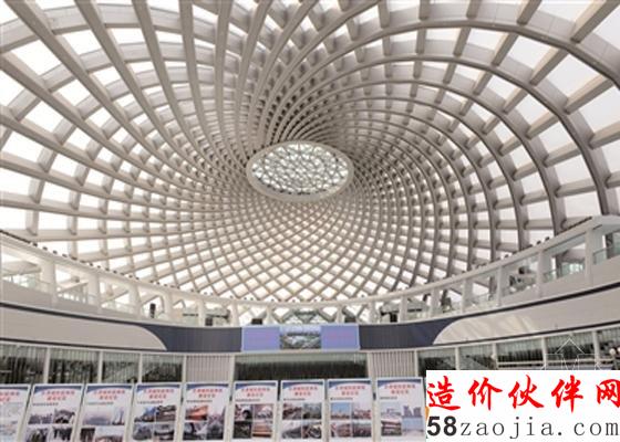 记者发现,“贝壳”型穹顶采光屋面虽然看似低调,但其在设计理念及施工工艺等方面都有着独到之处。走进大“贝壳”,记者发现偌大的空间却看不到一根横梁立柱。工程人员告诉记者,这一贝壳穹顶的结构形式为大跨度空间复杂曲线网格结构,由36根正螺旋和36根反螺旋“编织”而成,其最大跨度达到了143米、宽约80米、高约25米,再配以透光性ETFE膜结构外墙,使得穹顶屋面立面简练而又有活力。据了解,这种结构的技术含量颇高,在国内可谓仅此一家,国外也是鲜有前例。