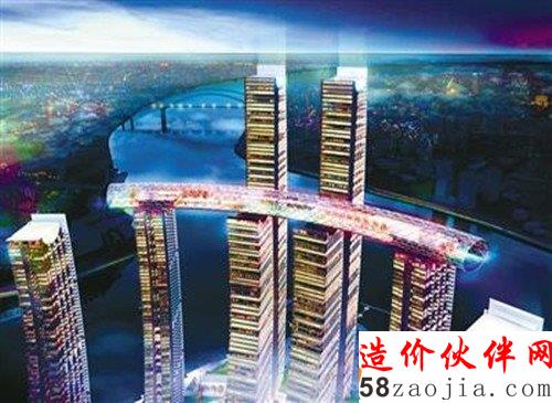 由水晶连廊串联各栋高楼,是项目工程的最大难点。水晶连廊为钢结构,以这种方式连结几座塔楼的时候,结构设计和施工都会变得复杂。一般而言,这种庞大的高空连体结构可分为两大类:要么相连的塔楼连成一体,如北京的中央电视台总部大楼,要么通过一系列伸缩缝使其在结构上相互独立,如新加坡的滨海湾金沙酒店。