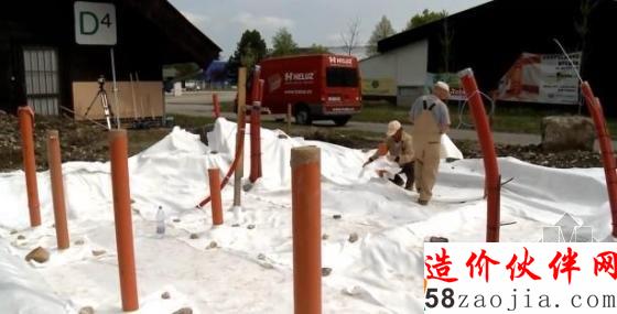 预埋管道,夯实地基,铺上防水层: