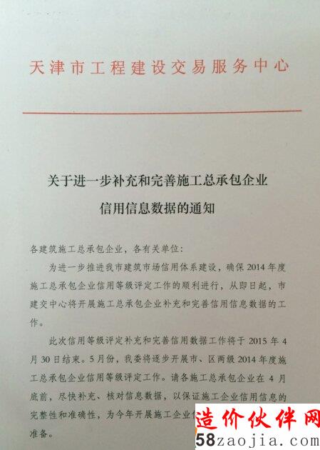 [天津]关于进一步补充和完善施工总承包企业信用信息数据的通知