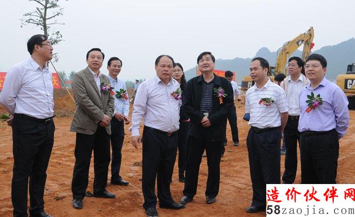 崇左市市委书记黄克(前左三)、自治区住建厅副厅长封宁(前右二)、崇左市市长孙大光(右一)、崇左市副市长高新(左一)等领导在园博园项目现场了解规划建设情况