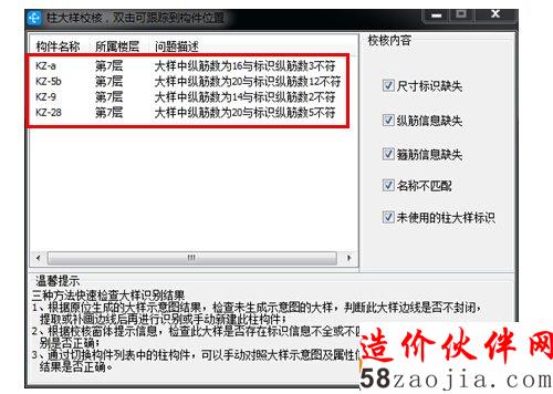 由上图可以看出,此次识别70项柱大样后提示出错的只有4项。KZ-a部分角筋和箍筋识别错误提示需要校核;然而KZ-b识别错误却没有提示校核,这样就需要算量人员在建模时对识别生成的构件信息一一进行核对。